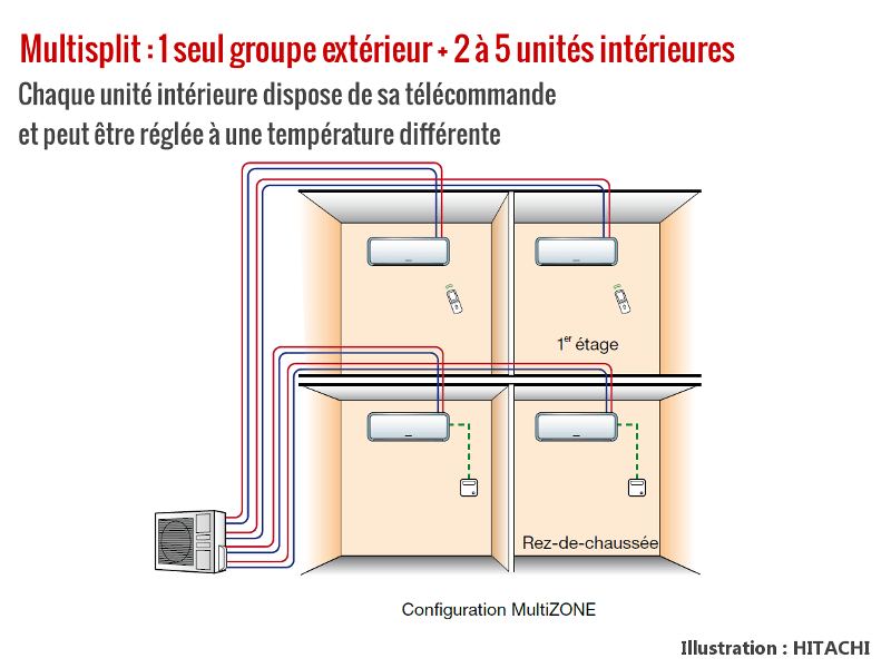 Si vous souhaitez chauffer deux pièces, vous avez deux solutions : opter pour un multisplit ou, comme cela est représenté sur l'image ci-contre installer deux groupes extérieurs dont chacun alimente en chaleur une seule unité intérieure. La technologie d'un monosplit est plus basique que celle d'un multisplit (une seule température à gérer), c'est donc souvent une solution plus économique. Mais il faut accepter d'avoir deux groupes extérieurs.