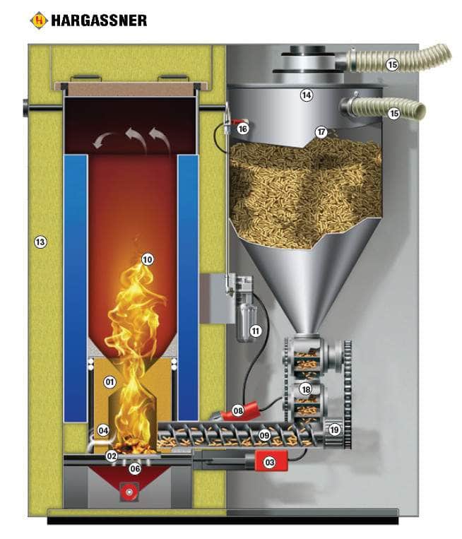 Nous préférons très nettement le système du transfert pneumatique qui transporte les granulés dans un tuyau de 5 cm de diamètre : un aspirateur situé dans la chaudière les appelle chaque fois qu'il est nécessaire de remplir le silo interne situé directement dans la chaudière, et qui représente à peu près la moitié de son volume (derrière la porte de droite, comme le montre le schéma en coupe plus bas dans cet article).