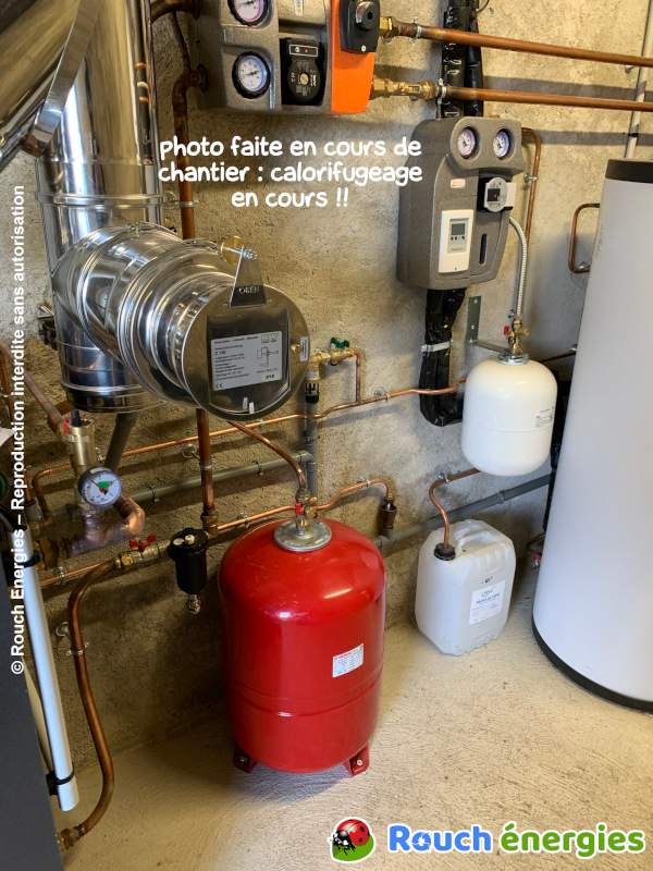 On en voit ici un aperçu, dont une partie relève du chauffe-eau solaire, de haut en bas : module hydraulique chauffage, station solaire, vase d'expansion sanitaire (blanc), modérateur de tirage, soupape thermique, désemboueur, un des 2 vases d'expansion chauffage (rouge), bidon de surveillance du caloporteur du chauffe-eau solaire.