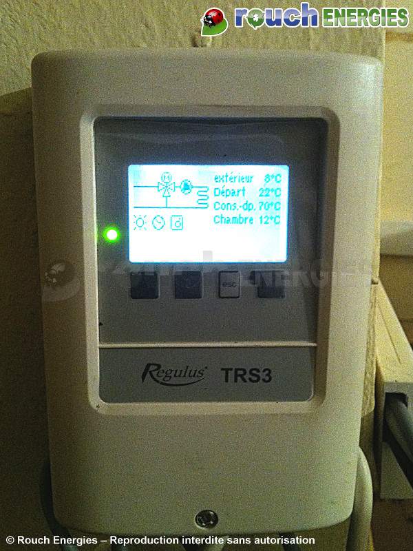 Ici, une régulation climatique envoie les ordres au module hydraulique pour ouvrir plus ou moins la vanne 3 voies. L'occupant programme la température de confort qu'il souhaite obtenir dans son habitation, et la régulation s'occupe du reste en fonction de la température qu'elle relève à l'intérieur de l'habitation, mais aussi à l'extérieur.