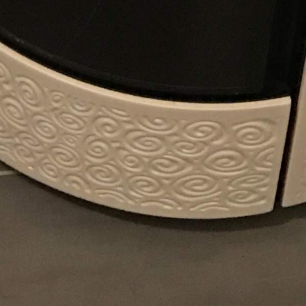 Composé de faïence, il affiche un motif en creux : des volutes spiralées .