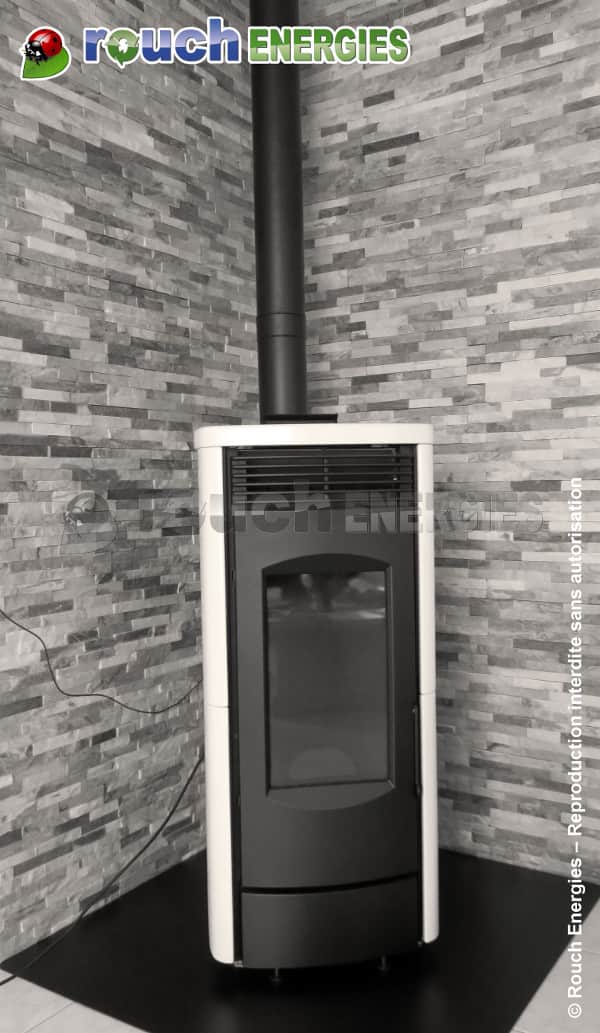 Dans le cadre d'une rénovation énergétique complète incluant isolation thermique des combles, chauffe-eau thermodynamique et aérovoltaïque R-Volt, nous avons installé ce poêle à granulés CMG dans de cette maison de Loubières, près de Foix en Ariège.