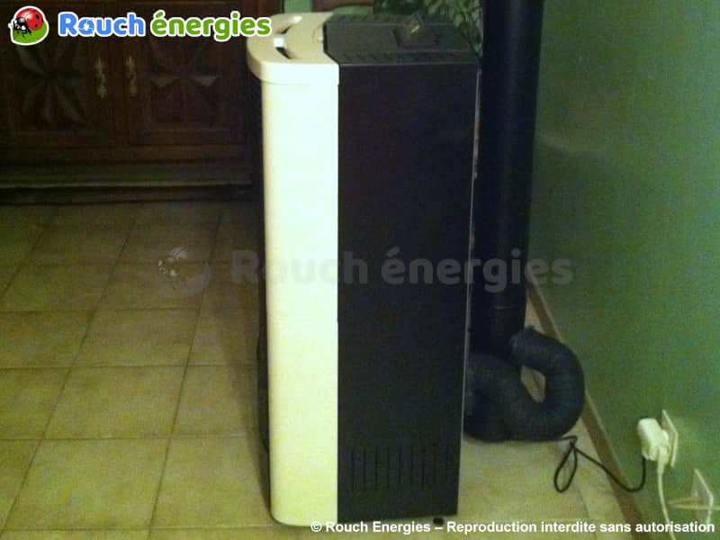 Comme on le voit sur la photo ci-contre, afin d'améliorer le tirage de l'appareil, ainsi que son rendement et le confort des habitants, nous avons réalisé une amenée d'air comburant au poêle à granulés.