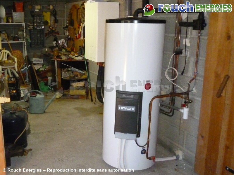 La pompe à chaleur Yutaki S de Hitachi qu'on aperçoit derrière le chauffe-eau thermodynamique peut être équipée d'un ballon d'eau chaude. Mais nous préférons très nettement, pour un budget sensiblement équivalent, lui adjoindre une pompe à chaleur spéciale ECS : un chauffe-eau thermodynamique.