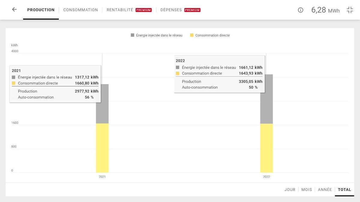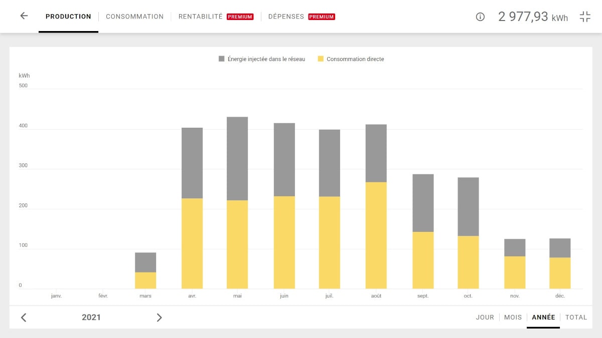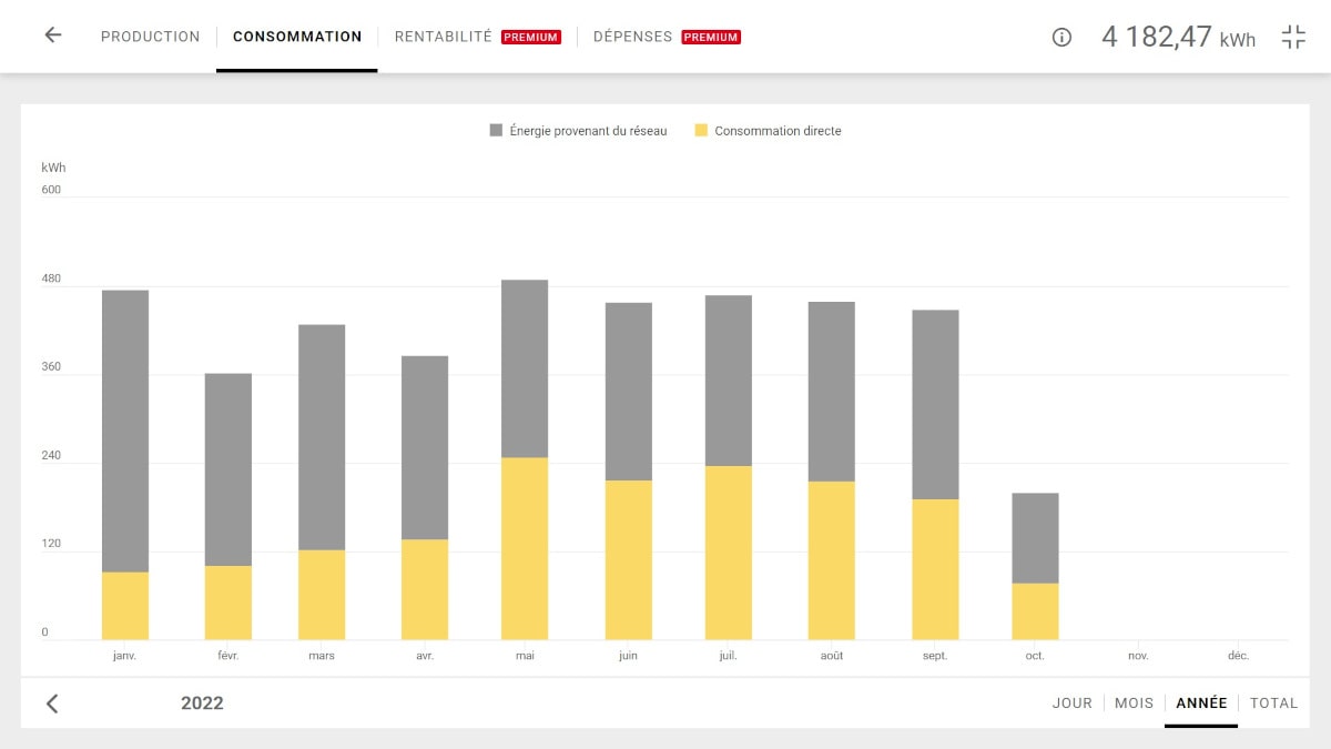 Mais rares sont les moments où on peut consommer 100% de la production : il y a les jours où vous n'êtes pas à la maison, les moments où aucun appareil électrique autre que le réfrigérateur et le congélateur ne fonctionne, etc.