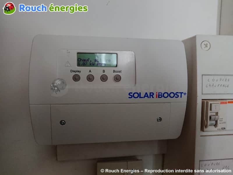 Nos clients étant équipés, pour leur production d'eau chaude sanitaire, d'un chauffe-eau électrique, ils ont également souhaité être équipés d'un dispositif qui leur permettrait d'alimenter leur chauffe-eau avec l'électricité photovoltaïque : pour ce faire, nous leur avons installé un Solar iBoost+.