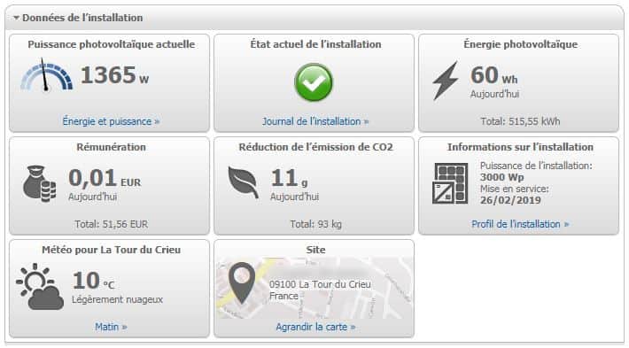 Pour commencer, sur Sunny Portal, vous aurez une vue d'ensemble de votre installation photovoltaïque : la puissance photovoltaïque et l'état de l'installation à l'instant T, la quantité d'énergie produite ce jour, la rémunération du jour, les émissions de CO2 évitées, un rappel du profil de l'installation, la météo pour la localité et enfin la localisation. Les valeurs totales sont également indiquées en plus petits caractères.