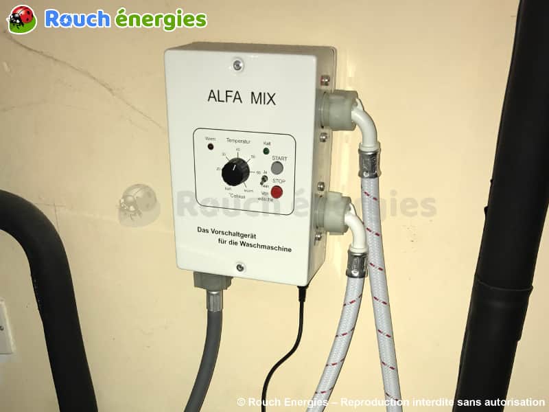 Pour régler la température de l'eau qu'on envoie au lave-linge - et ainsi éviter de faire bouillir les laines fragiles par exemple - on équipe le lave-linge d'un appareil dédié, ici un Alfamix.