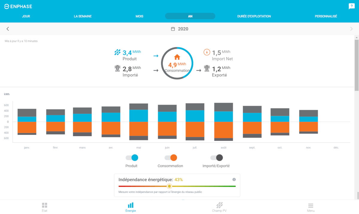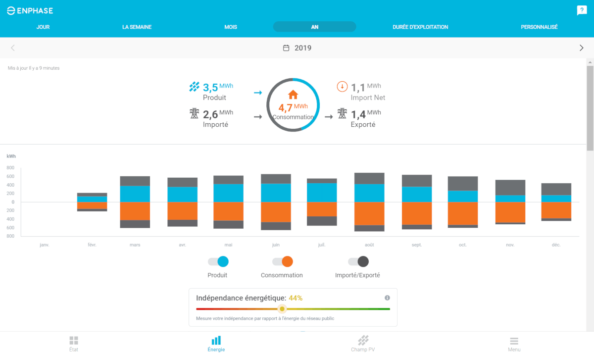 Ce qui se confirme fin 2020 dans l'interface Enphase Enlighten, avec un taux d'indépendance énergétique de 44% sur la durée totale d'exploitation :