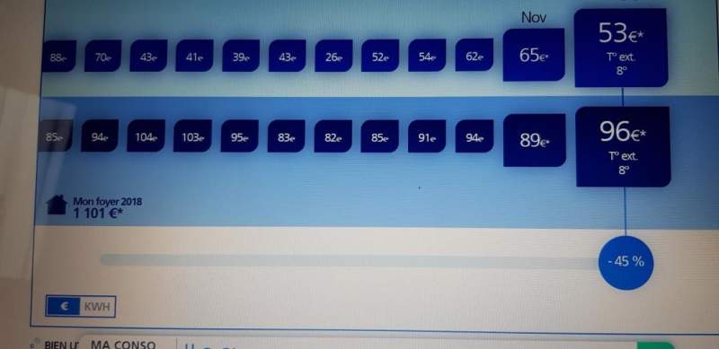Un an après la mise en service de leur photovoltaïque pour l'autoconsommation, nos clients nous ont envoyé une capture d'écran de leur espace client en ligne, montrant la comparaison, sur une année complète, de leur consommation avant et après l'installation du solaire :