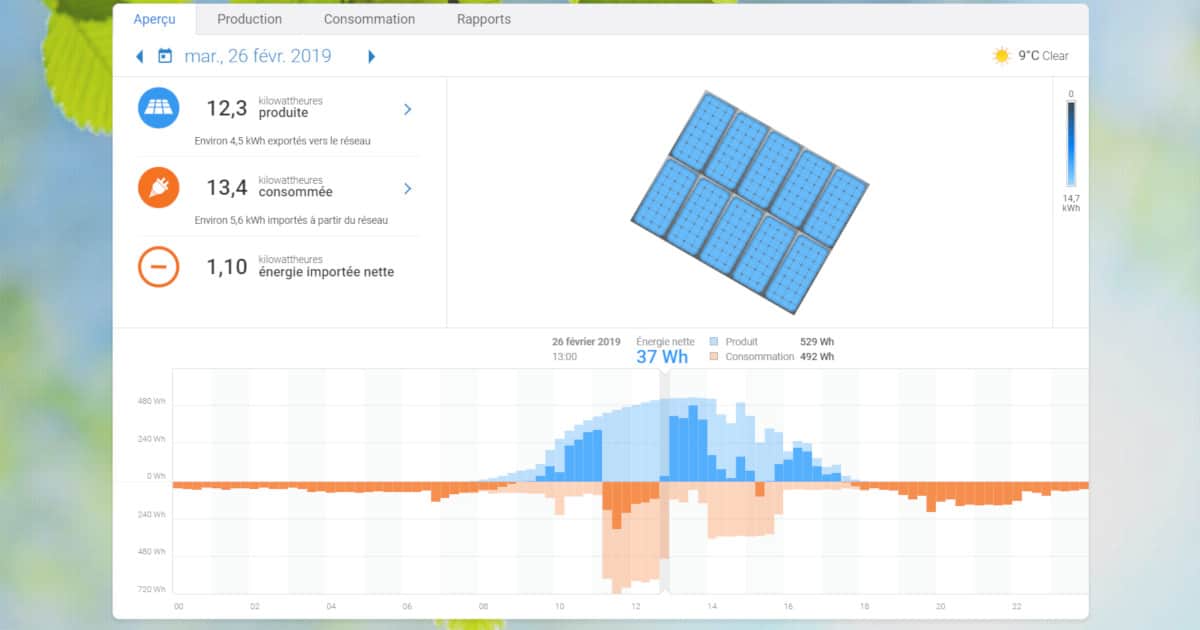 Elle lit à la fois la production photovoltaïque et la consommation de la maison, et les affiche sur des graphiques en tranches de 15 minutes qui montrent au propriétaire de l'installation si production et consommation sont bien synchronisées ou pas.