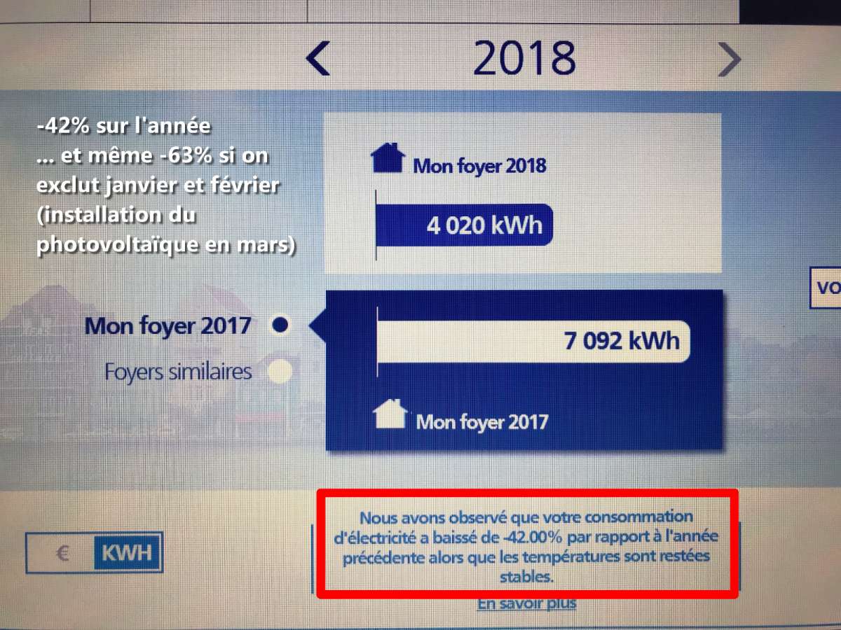 Moins 42% depuis le 1er janvier, et même -63% depuis la mise en service de l'installation photovoltaïque en mars 2018, ceci avec des températures extérieures restées stables entre les 2 années, comme l'écrit EDF.