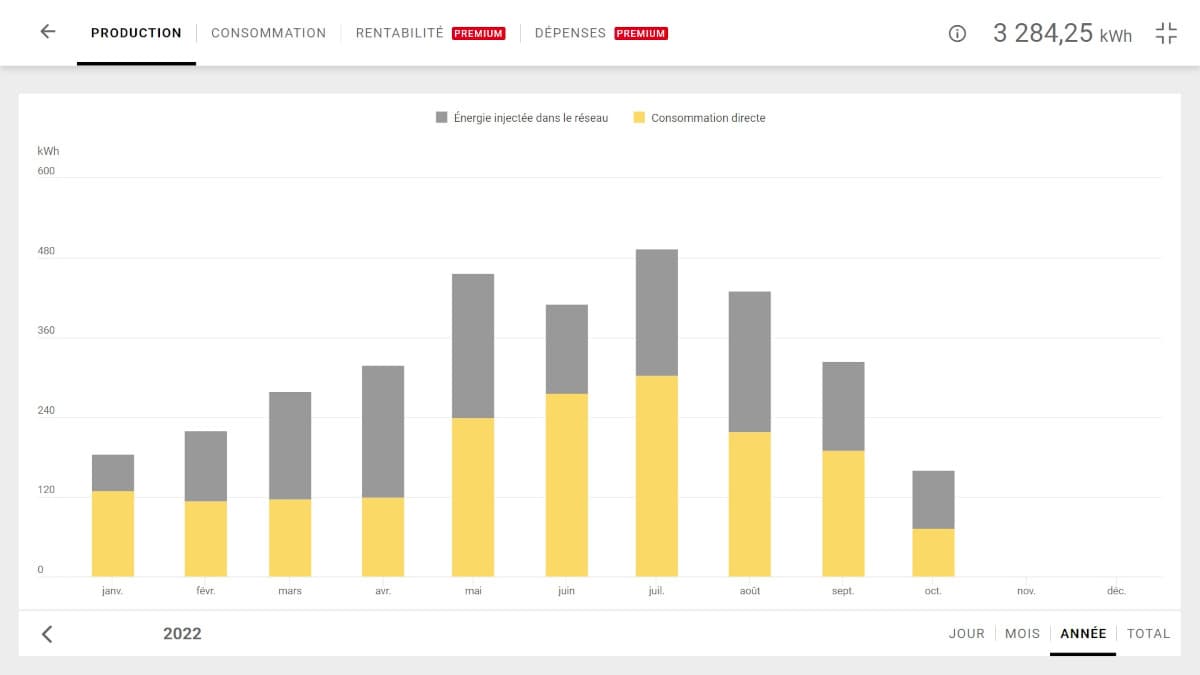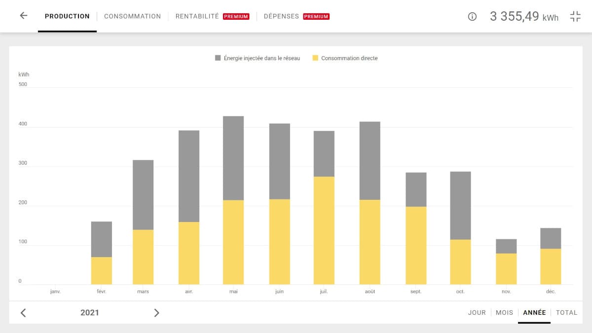 Mais rares sont les moments où on peut consommer 100% de la production : il y a les jours où vous n'êtes pas à la maison, les moments où aucun appareil électrique autre que le réfrigérateur et le congélateur ne fonctionne, etc.