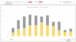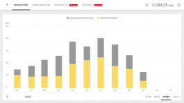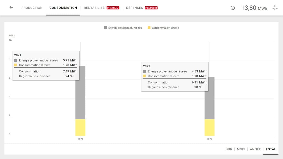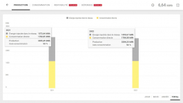 Ici, avec 3 kWc dont un peu plus de 50% de la production est autoconsommée, le solaire permet de couvrir 24% des 7490 kWh consommés en 2021 et 28% des 6310 kWh consommés en 2022.