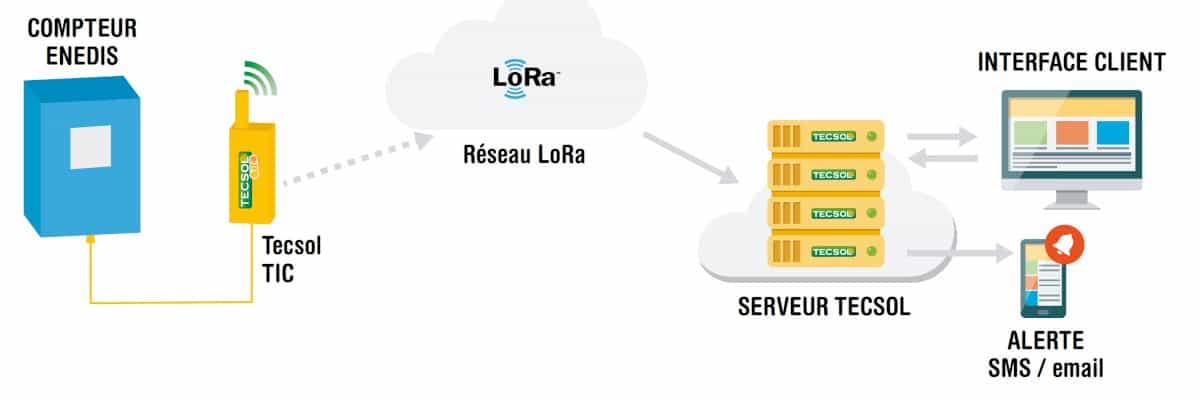 Le principe est simple : directement connecté au compteur Linky, Tecsol TIC envoie les données de production toutes les 10 minutes à la plateforme Tecsol Analytics, via les ondes radio. Le propriétaire de l'installation peut ainsi surveiller la performance de la centrale photovoltaïque sans se déplacer, depuis un navigateur internet. Et surtout, en cas de dysfonctionnement quelconque - le cas le plus fréquent étant la mise en sécurité suite à un orage, une surtension ou des travaux sur le réseau - l'exploitant reçoit une alarme par SMS et/ou par email pour l'avertir qu'il doit intervenir sur site.
