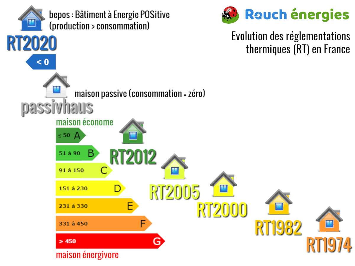 Pendant toute cette période, les RT1974, RT 1982, RT2000 et RT2005 ont fonctionné à peu près de la même façon, avec une simple obligation de moyens. En d'autres termes, la loi imposait simplement la mise en oeuvre d'une certaine épaisseur d'isolant par exemple. On estimait que cela conduisait naturellement à de meilleurs résultats sur le plan thermique, et que la consommation d'énergie de la maison s'en trouverait forcément réduite.