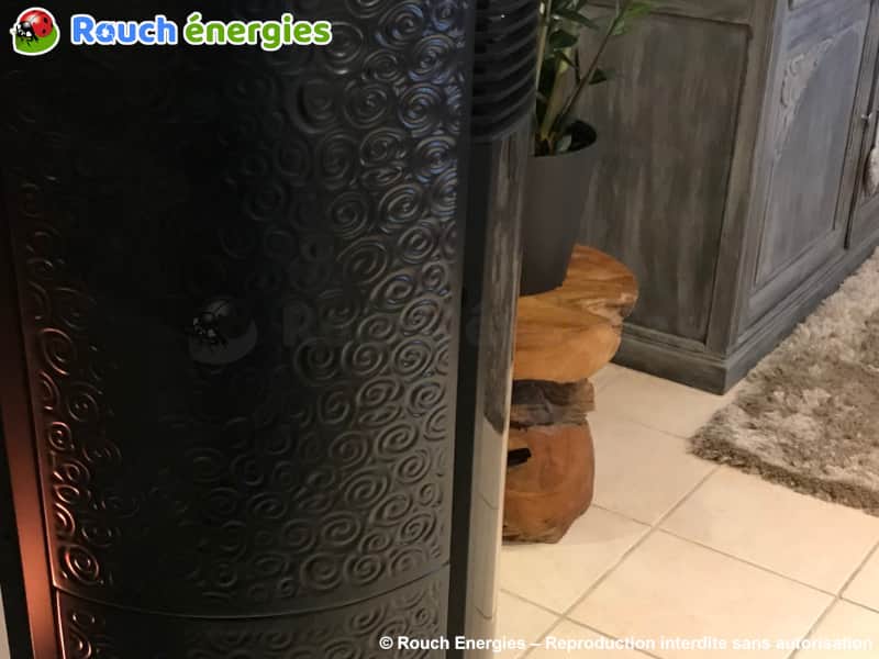 Il s'agit d'un motif à spirales qui confère une grande allure à ce poêle, qu'on le choisisse en noir, comme ici, ou en blanc comme là.