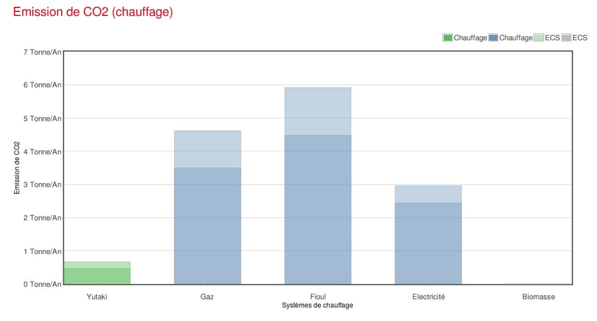 La comparaison des émissions de CO2 des différentes énergies de chauffage est affichée dans le rapport Hitachi que nous joignons à notre devis :