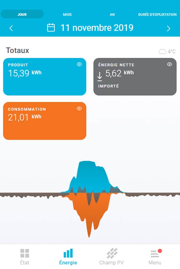 Mais elle nous donne aussi accès aux mêmes données que le propriétaire, parmi lesquelles le graphique de production et consommation du jour :